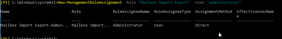 New-ManagementRoleAssignment -Role "Mailbox Import Export" -User "administrator"