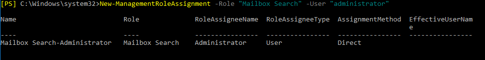 New-ManagementRoleAssignment -Role "Mailbox Search" -User "administrator"