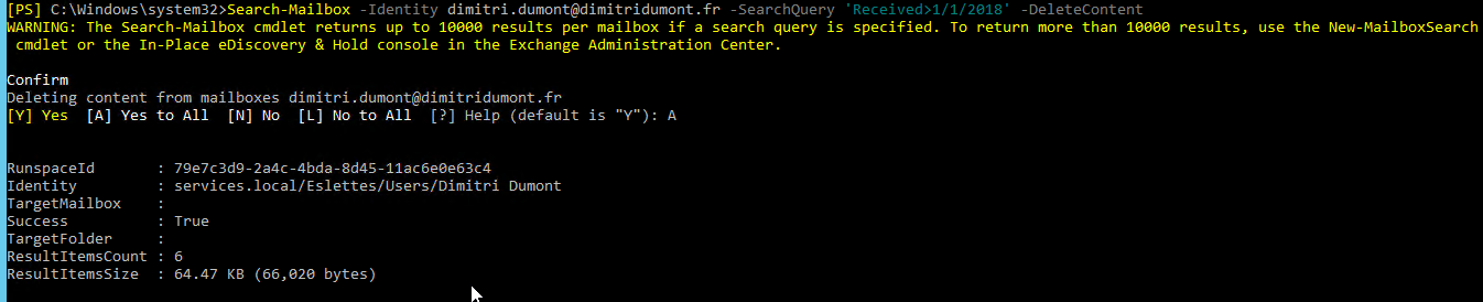 Search-Mailbox -Identity "mail@domain.fr" -SearchQuery 'Received<1/1/2017' -DeleteContent